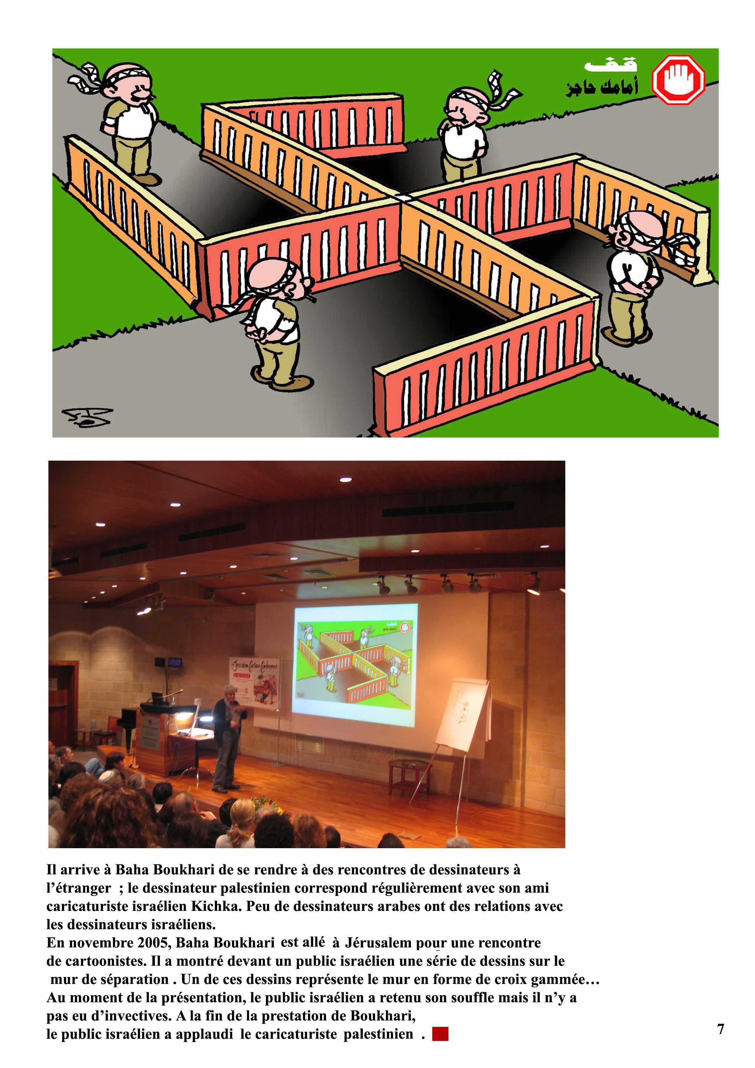 Ce contexte, que notre dessinateur du Monde a pris en photo, il l’expose dans une légende placée en-dessous. C’était en novembre 2005, une rencontre de cartoonistes à Jérusalem. Boukhari y a présenté une série de dessins, dont celui-ci, devant une nombreuse assemblée composée en grande partie par des collègues israéliens. A-t-il été voué aux gémonies ? L’a-t-on immédiatement frappé d’ostracisme médiatique à vie pour antisémitisme flagrant ? A-t-on même tenté de lui casser la figure ou tout simplement hué ?