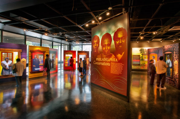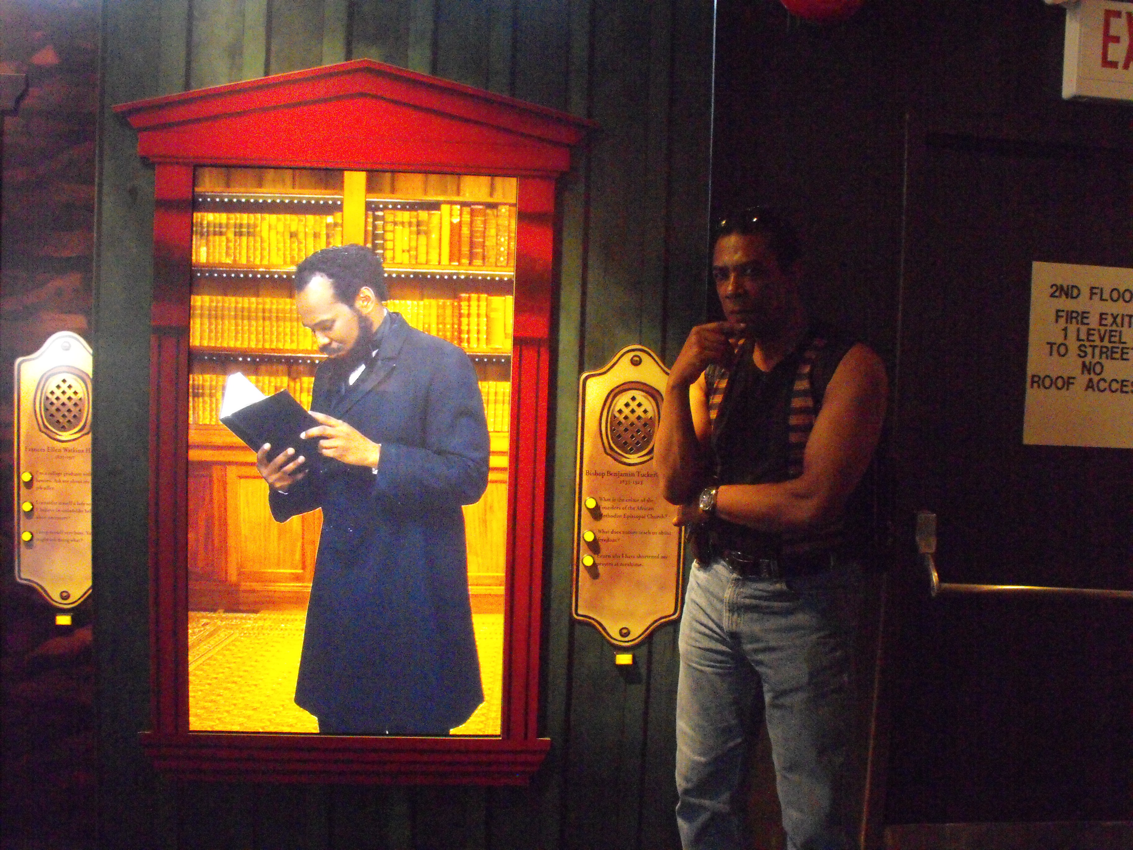 Ironiquement situé juste en face du pénitencier de Philadelphie, le musée Africain Américain se pose dans un angle de la 11è rue. Le titre m’a interpellé. Que peut-il se trouver de si particulier là-dedans? La manière dont il nargue cette prison est déjà tout un programme. On comprend qu’il inscrit l’histoire vivante dans le présent en marche. L’histoire, ce n’est pas simplement du passé mais bien une manière de signifier et comprendre les questions du présent. Il est clair que ce musée se pose en miroir du pénitencier, que le présent de celui-ci se reflète dans le passé que recèle les façades de celui-là. Je tourne le dos aux murs patibulaires de la maison d’arrêt et, traversant la rue, j’entre circonspect dans cet immeuble d’apparence à peine plus sympathique qui abrite le musée.
