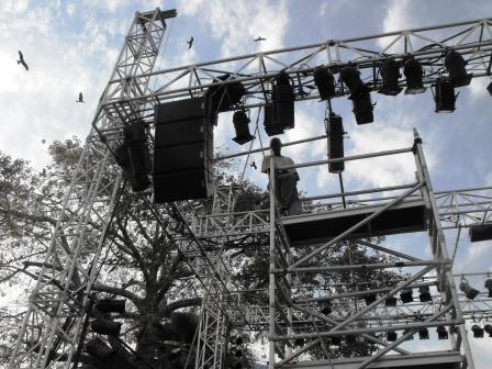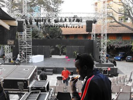 Le ballet ennivrant de centaines d’éperviers dessine sur le bleu d’un ciel impassible la fin du dernier acte d’une journée de plomb. La stridence de leurs cris rythme les gestes mesurés des techniciens qui, depuis le point du jour installent la scène pour notre pièce enfin annoncée. Bien qu’épuisé, je suis d’un calme qui me surprend, tout pénétré que je suis de la sérénité de ce ciel qui recouvre Dakar d’un manteau de douceur. Le chant du muezzin s’est tu et le vert minaret se laisse enrober du chant silencieux des rayons de soleil mordorés. Il nous reste deux heures à peine pour implanter les lumières dans cette nuit qui nous vient à petit pas. Cette nuit est à nous. Cette nuit est la nôtre. Il me faut être maintenant d’une grande précision. Toute erreur est fatale pour le spectacle, tout malentendu nous est décompté sur le peu de temps qui nous est alloué. Il faut faire avec ce qu’ils ont et jamais essayer de tenter l’impossible. Peu de projecteurs, peu de possibilités de combinaison. Ici la découpe sur la table. Là la douche sur Angela Davis. Les gelatines ambres sont trop sombres. Ca ne fait rien, enlevons les on fera en blanc avec moins d’intensité. Les palmiers en pot empruntés dans le jardin d’à côté feront un beau rideau d’arrière scène signifiant le parc de la maison de Gerty. Les douches diagonales sur leurs palmes sont du plus bel effet. D’un seul coup, le mouvement des éperviers s’accélère, une vraie frénésie. Le ciel s’épaissit. Ils crient la nuit qui vient et saluent les derniers rayons du soleil avant de venir se poser en grappes sur les branches de l’immense fromager qui coiffe la scène. Le drap blanc qui recouvre la table et que j’ai fait repasser garde encore des plis qui joueront le jeu d’un théâtre pauvre et voulu ainsi. Une tache de fiente d’éperviers le macule déjà. On craint qu’un nouvel envol, un ernier baroud de ces guerriers du ciel ne vienne bombarder cette nappe de manière définitive. Le vent souffle, et dans le mauvais sens. Il faut absolument soutenir la voix des comédiens par des micros posés discrètement à fleur de scène. Le réglage du son est délicat. Effet par effet nous avançons. Ces techniciens sont formidables. Jamais un mot plus haut que l’autre. Ils cherchent immédiatement une solution la plus ingénieuse possible avec leurs faibles moyens techniques. Le temps passe trop vite. Il n’est plus temps. Nous n’aurons pas de filage technique. Je décide de l’annuler. Il est primordial que tous les effets soient le mieux calés possible. La fébrilité monte. Problèmes de son. Le lecteur ne lit pas des passages. Heureusement, ce n’est que du vent enregistré. On décale le minutage. Pas question de mémoriser les effets et leur durée. On fera à la main en improvisant sur le jeu. Je ne suis pas régisseur, mais je commence à prendre un peu d’assurance à la régie entre le régisseur son et celui de la lumière. Je me dis que ça ira. Mais je redoute encore les effets qui ne partent pas au bon moment. On essaie encore le niveau du son. On lance le premier passage du vent, c’est le cyclone et les éperviers s’envolent tout à coup, terrifiés. Des effets lumière ne fonctionnent pas. Tant pis, on simplifie. Il reste un quart d’heure avant le début du spectacle. Les comédiens sont déjà en scène, concentrés derrière les panneaux de bois qui nous servent de rideaux de fond de scène. 21h 15. On n’a qu’un quart d’heure de retard. Une vraie performance. Le public est venu nombreux. Top départ. Noir, son 1, effet lumière 1. Ca marche mais on n’entend pas Marie Noëlle. « Si ce n’est le vent… » dit-elle. En effet, c’est le vent qui te souffle ta voix, la bouscule, la bouleverse. Le technicien son ne comprend pas tout de suite mes gestes. On a perdu 3 ou 4 phrases si on est sur le haut des gradins. Ouf, on l’entend. C’est parti. Effet 2, effet 3. Ca roule. Mais je vois des entrées et des sorties de spêctateurs qui perturbent. On m’avait prévenu. C’est ainsi ici. Des spectateurs qui croyaient être venus à un concert s’en vont tandis que d’autres arrivent. Un militaire passe et repasse plusieurs fois devant la scène pendant qu’Angela dit; « Je suis communiste et j’en suis fier ». Je vois un photographe qui s’approche de la scène.