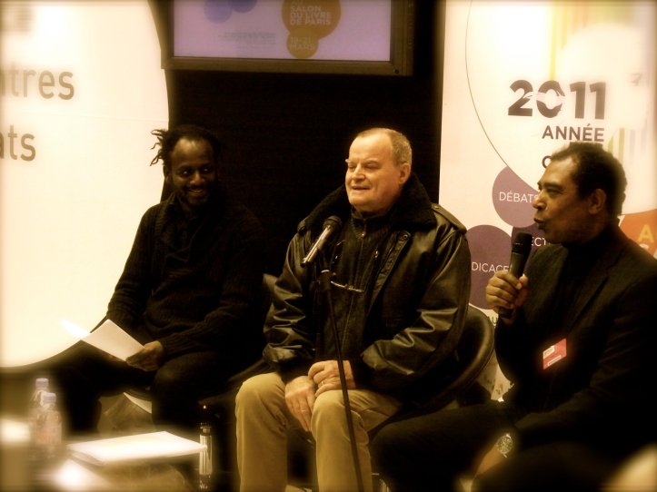 Vendredi 18 mars, 17h 30, stand des Outre-mers. Je suis invité à lire des extraits de ma pièce « Rue Saint-Denis » devant le public du salon du livre de Paris. Cette pièce étant en cours de création (rappel: à partir du 24 mars 2011 au théâtre de l’Epée de bois), je demande à Jean-Claude DROUOT qui fait partie de la distribution, de dire deux ou trois de ses monologues. Je demande également à Assane TIMBO de lire au débotté des passages du texte joué par Modeste NZAPASSARA, indisponible ce jour-là. Ce qu’il accepte volontiers et va faire avec brio.