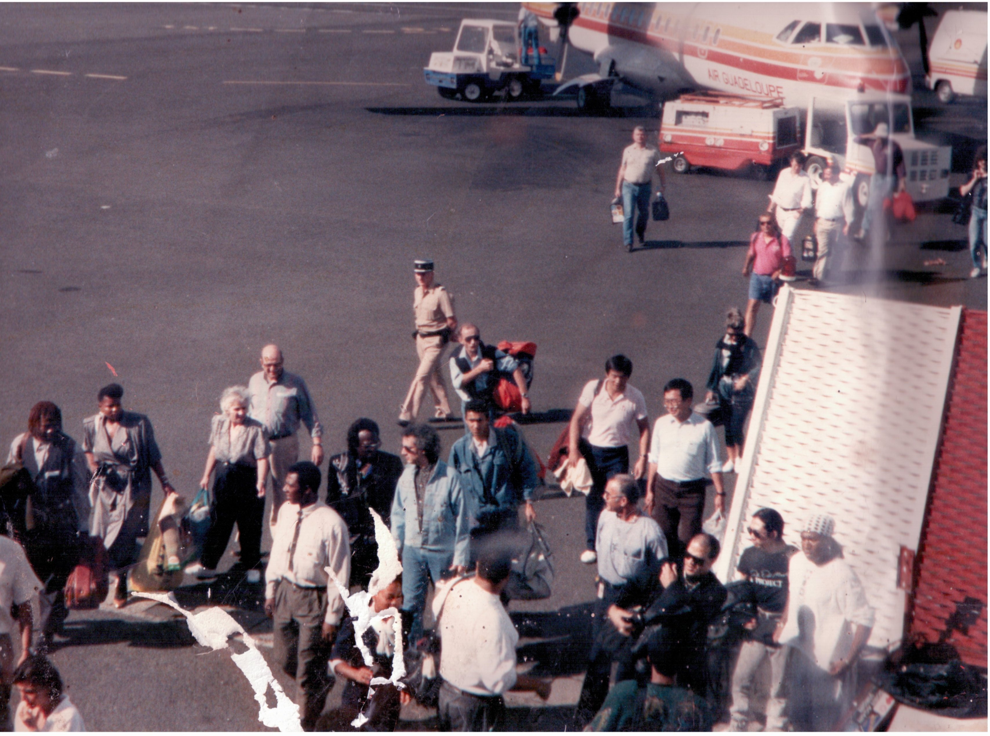 Je viens de retrouver cette photo dans mes archives. Tudjûû! Je n’y crois pas! J’ai beau compter et recompter, ça fait déjà 24 ans dans 15 jours que j’ai reçu Miles Davis en Guadeloupe. Un truc qu’on oublie pas. La galère absolue pour le faire venir de NYC en Guadeloupe à saute-moutons en finissant par ce petit ATR qu’on voit derrière et sa tonne et demi de backline plus la tonne et demi de lumières venant de Paris. Heureusement toute la Guadeloupe s’y était mise. Toutes les compagnies aériennes aussi. On voit à droite sur la photo l’excellent Luc Michaux-Vignes, directeur d’American airlines, grand amateur de jazz qui nous a donné un sacré coup de main. Mais on ne voit pas hélas le fameux Colonel Macchabée (c’est pas une blague, c’est son nom) commandant des forces françaises en Guadeloupe qui nous a aussi épaulés. Extrait mémorable d’une conversation avec lui: