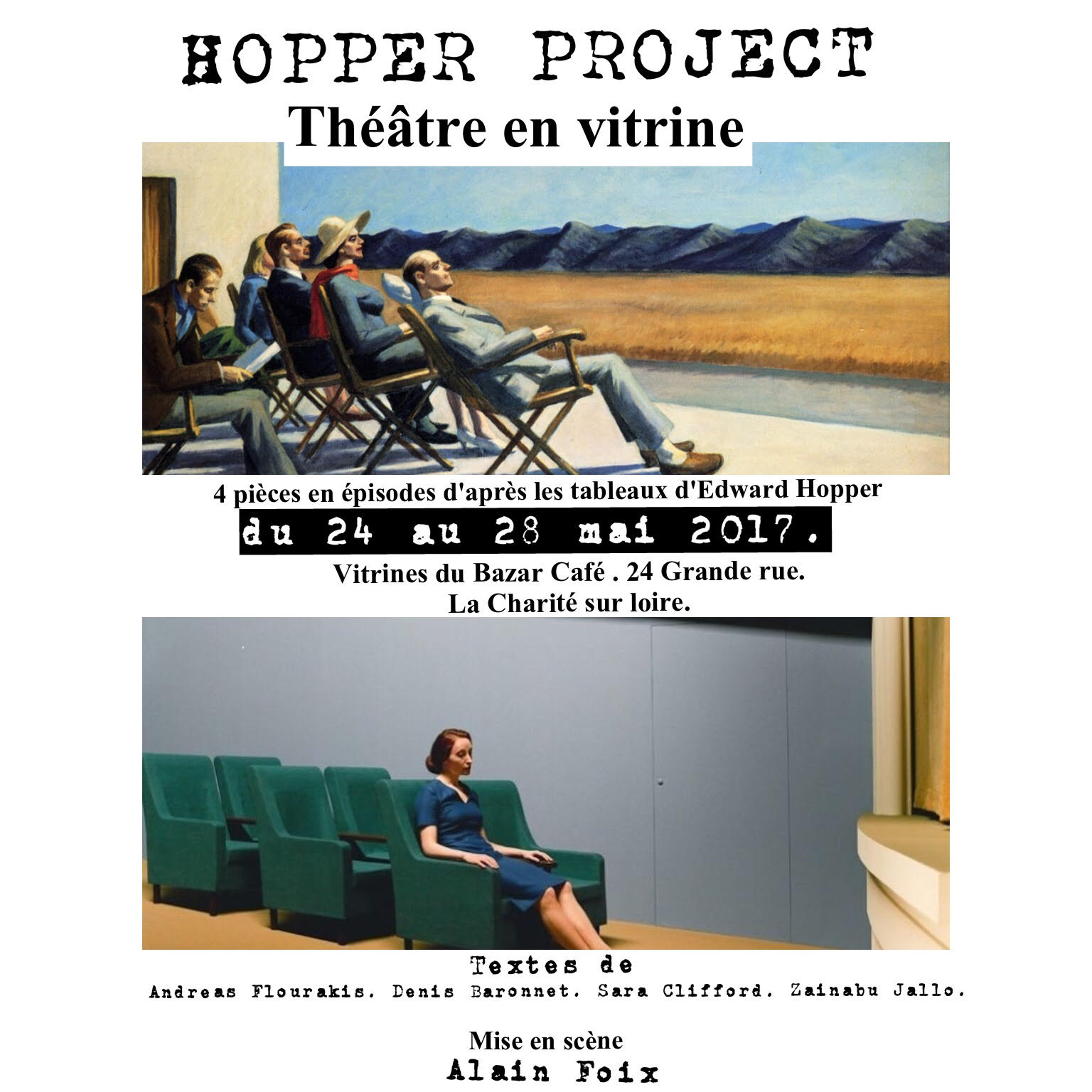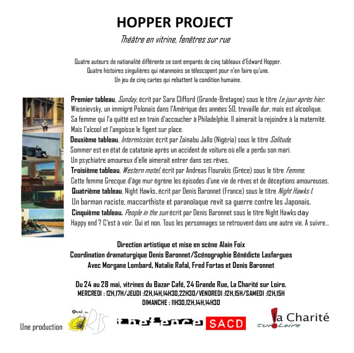 Il a fait appel à 4 auteurs du réseau international THE FENCE pour imaginer des pièces de théâtre s’inspirant de 5 tableaux du peintre américain Edward HOPPER dans lesquels les personnages deviennent vivants et ont une histoire.